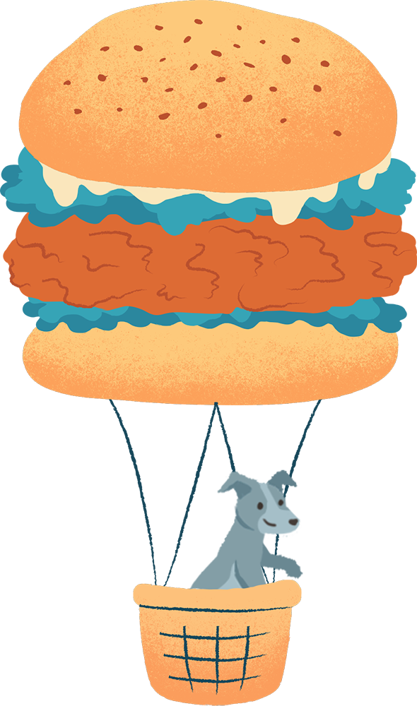 The brand identity Fishfinger built for this dog treat line does not resemble anything else on a pet store shelf. Each SKU occupies its own illustrated world — a distinct visual biome that transforms the treat flavor into a landscape. The Chicken Burger range sits inside a teal rolling-hills panorama where the hills themselves read as burger layers. Zooming out, a schnauzer rides a wicker basket suspended beneath a giant sesame-seeded bun, floating like a hot-air balloon through a pale sky. It is a single image that communicates flavor, whimsy, and brand personality simultaneously, without a word of body copy.