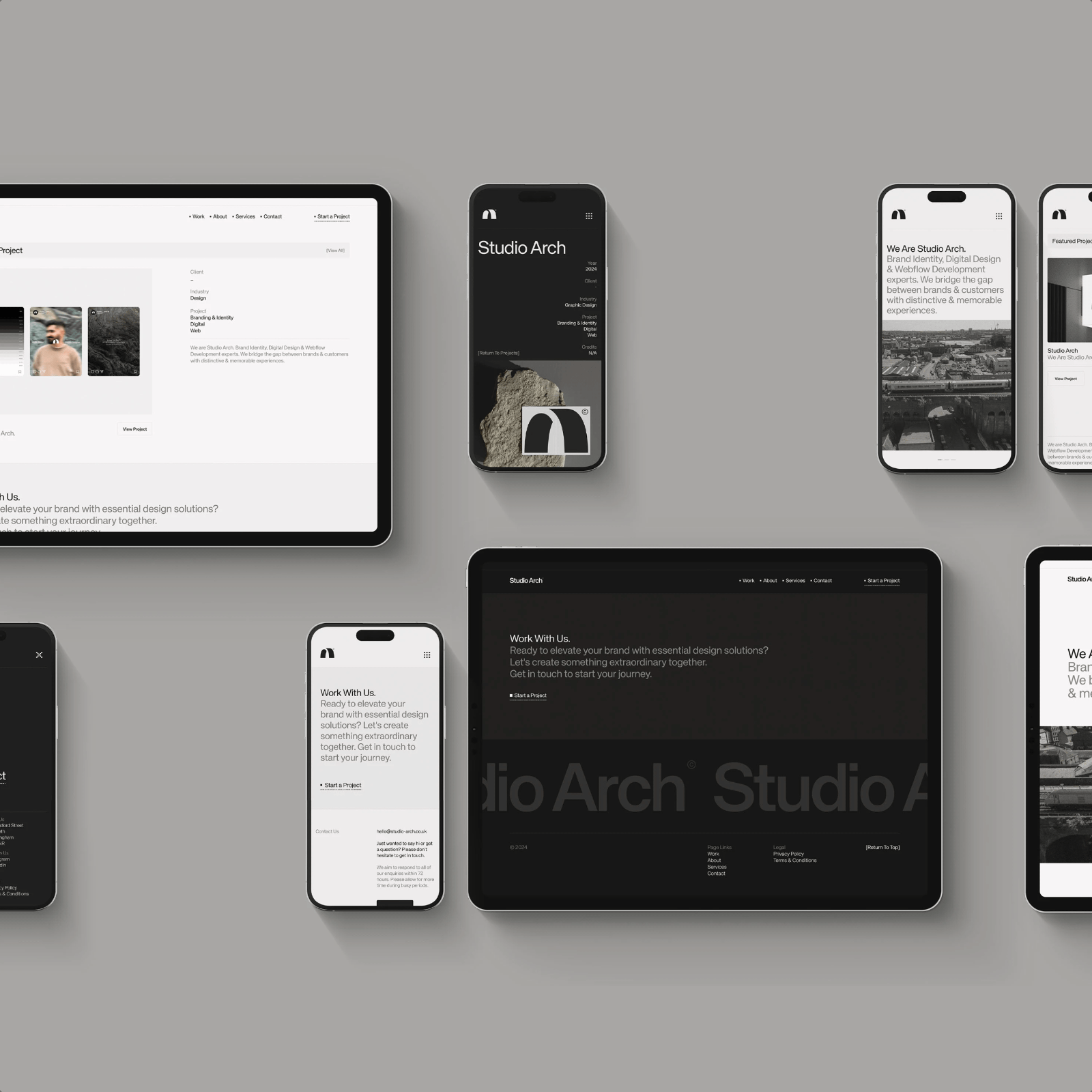 The brand identity centres on a restrained palette. Black, white, and varying greys form the core. These tones reflect the raw materials around the studio — concrete, steel, and weathered brick. The logo abstracts the arch motif into a clean structural shape. It carries both spatial and symbolic weight. Every element connects back to this foundational reference. Nothing is decorative.