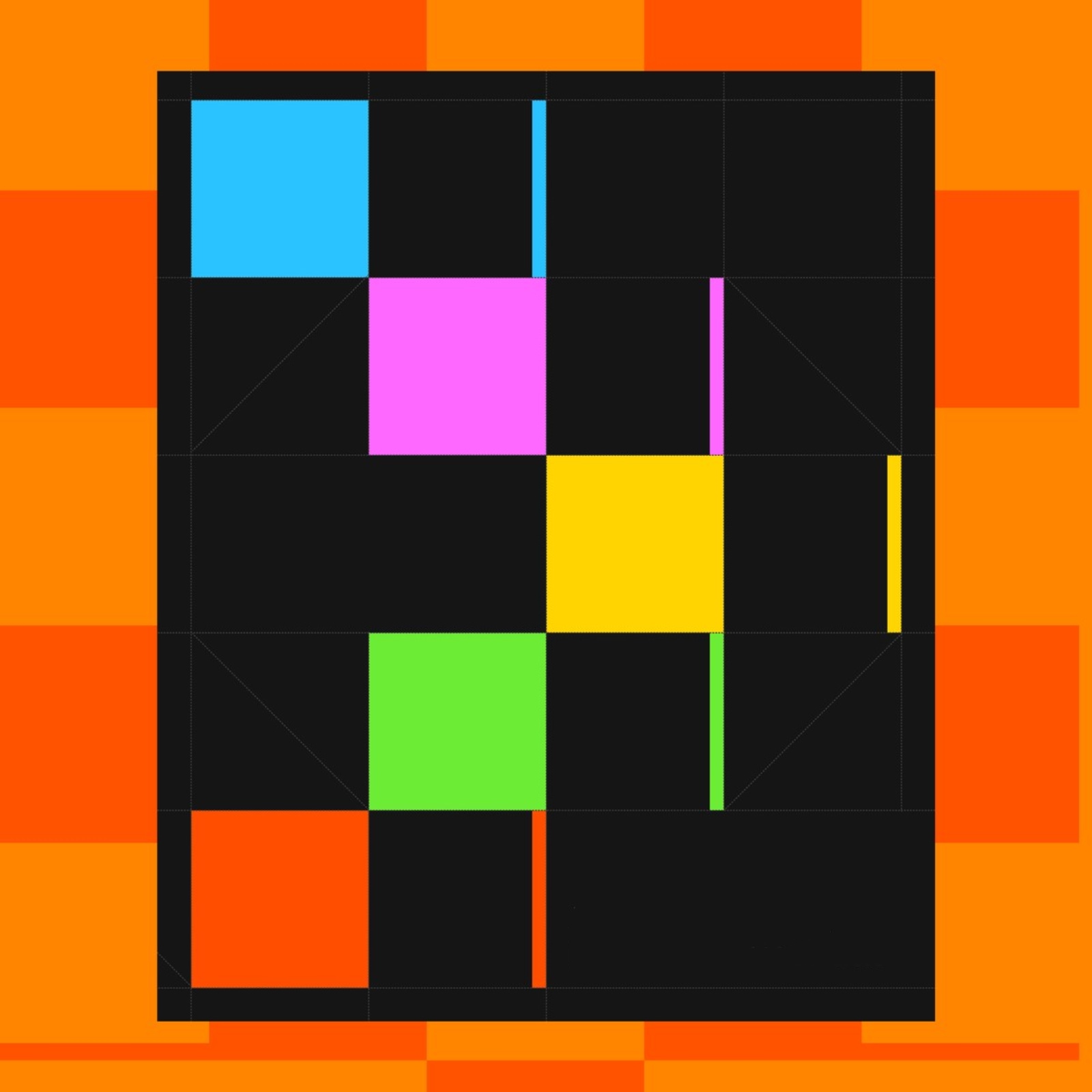 The color system pairs cyan, magenta, green, yellow, and orange against black — a palette that signals technical precision while remaining warm and inviting for Grafana's open-source community. The grid logic itself references Grafana's own dashboard panel architecture, so the identity literally echoes the product interface. Icons use rounded corners to introduce approachability without abandoning the modular vocabulary.
