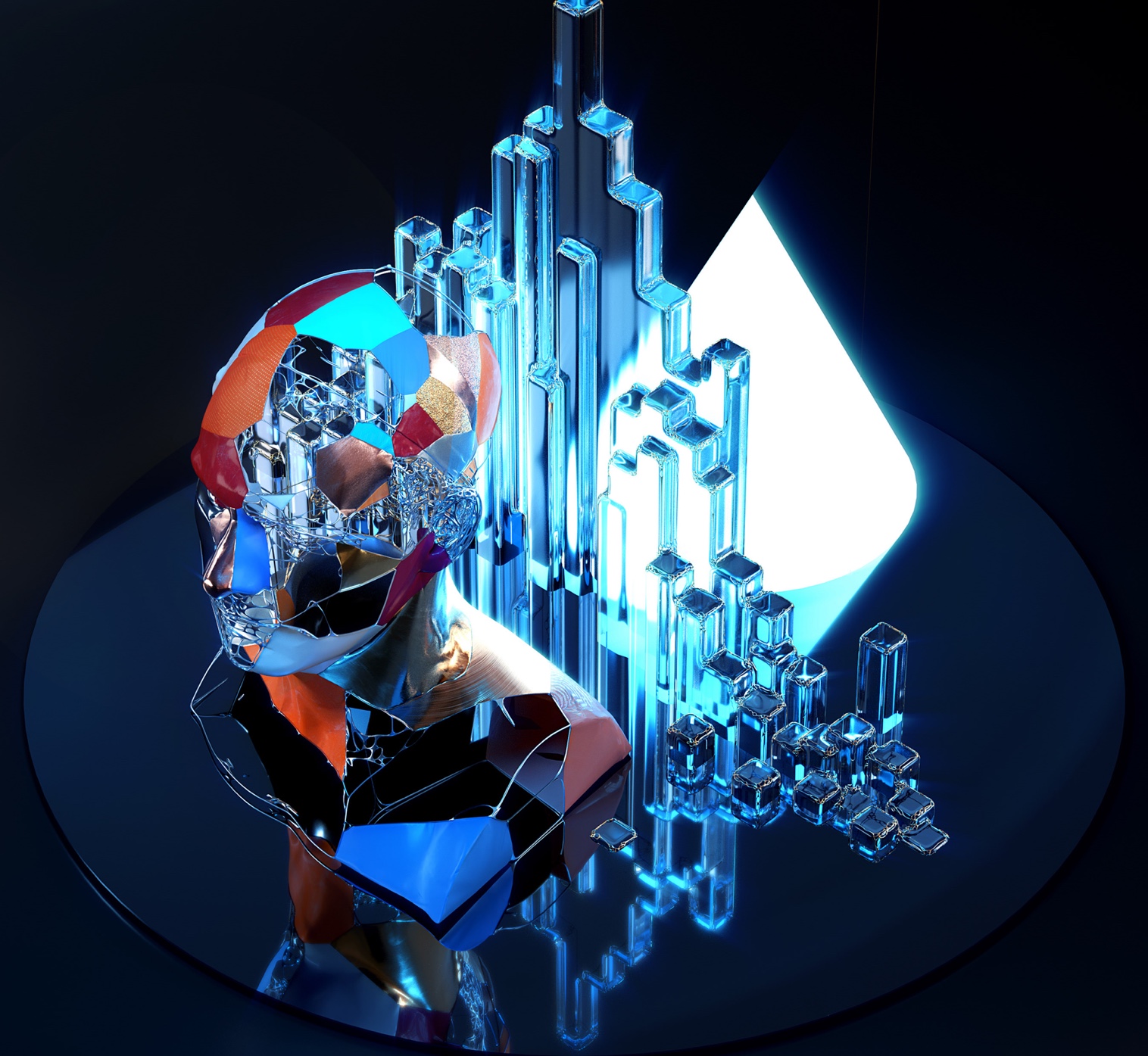These figurative works celebrate the human form in a story of playful, almost whimsical tints and tones. There is a machine-like structure of geodesic layers in every image. On one level, they are very traditional, very materialist in their philosophical vision. This world is the human body, the Greek-like limbless torso, the Roman bust-like head. But they are woven from a curious, macro-lens observation of weird and fantastical organic shapes that the ancient world of artists and sculptors would never have understood.
