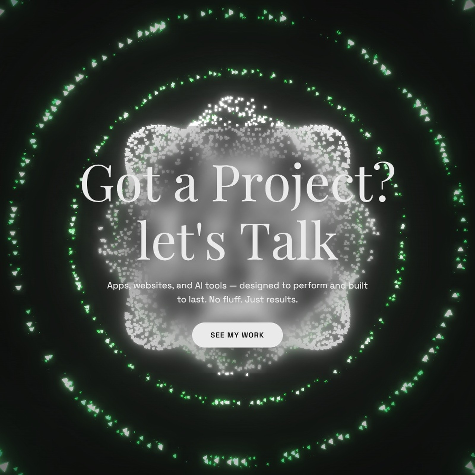 The hero is not static. A field of triangular particles orbits in concentric rings around a radial glow. In dark mode, the background flips to near-black and the particles become luminous — revealing a second face of the web design portfolio with the same layout, different atmosphere.