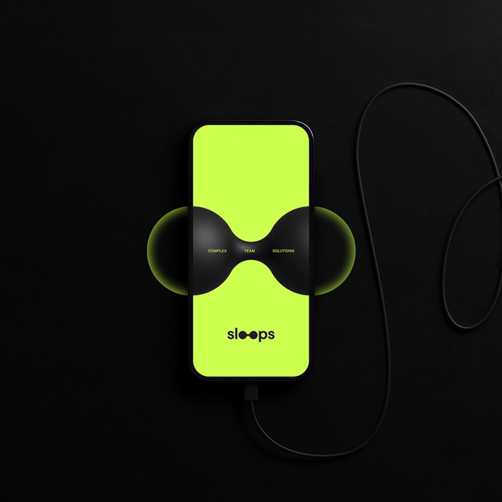 Tkvnk's design is characterized by a vibrant lime green accent against a stark black background. The core visual motif is a dynamic interplay of two circles, reminiscent of the metaballs effect in 3D graphics. This symbolizes the convergence of technology and creativity that Sloops fosters.